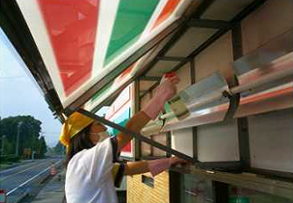 最初にプロの技術者が看板の外側や内側、軒天、そして店舗ガラス外側をしっかりとクリーニングしてから薬剤を塗布します。