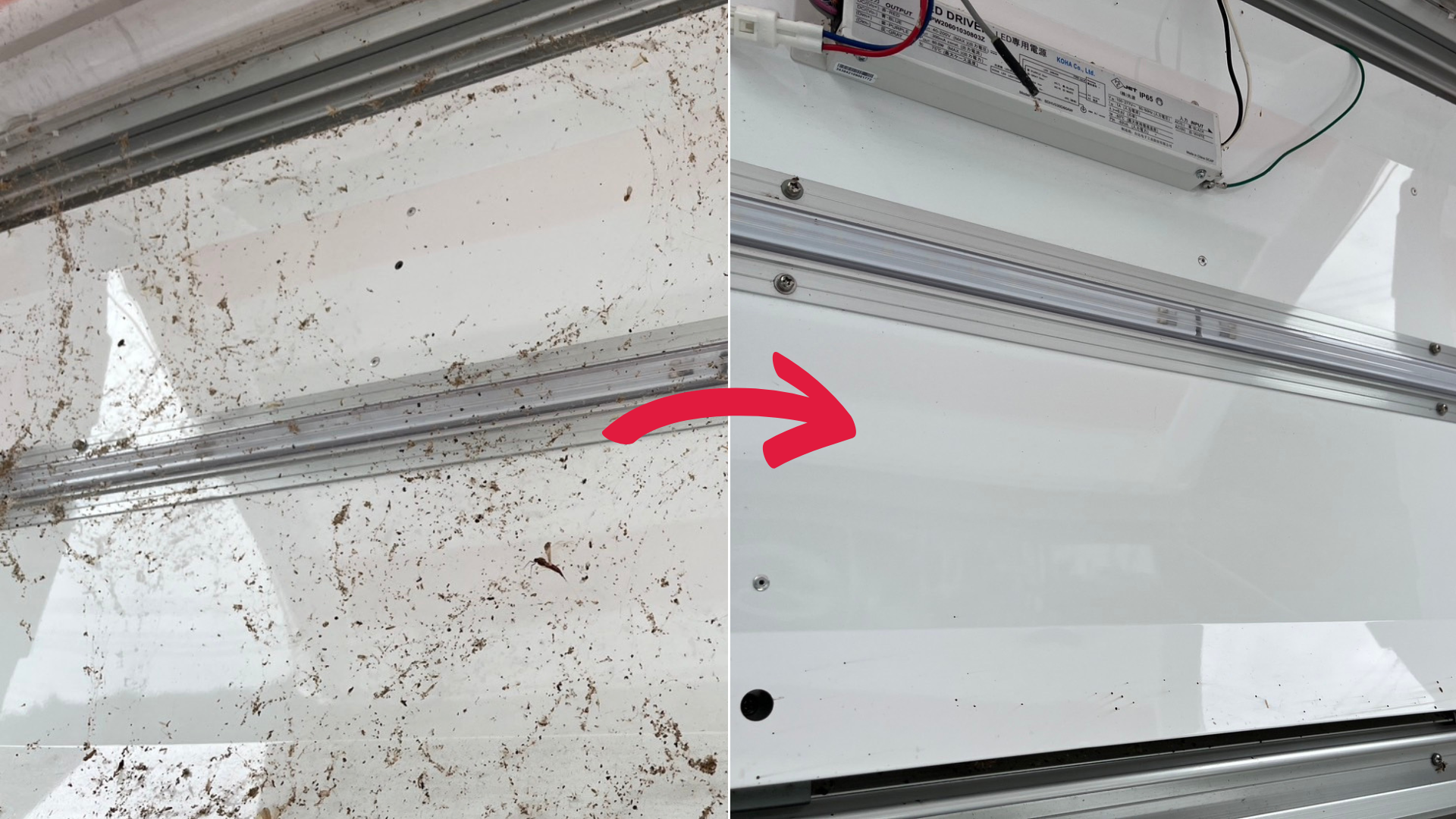 「夏場には小さな虫が店外ガラス面で死に、店内に入ってくる数も減りました。クモの巣は絶滅でき、最近店内のクモの巣もほとんどなく非常に満足しています。」小山市O店オーナー様